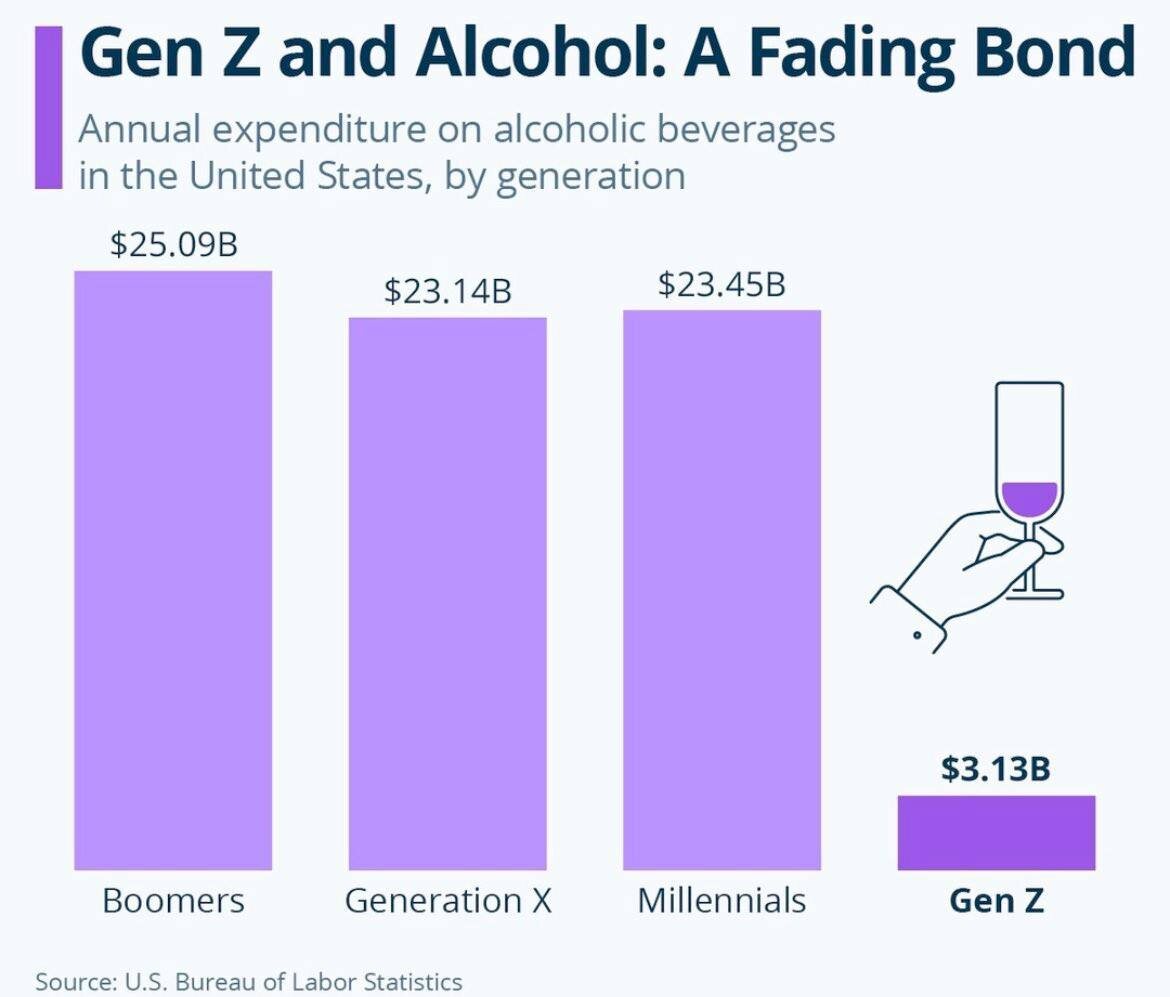 Зумеры больше не пьют: исследователи из США установили, что люди до 26 лет расходуют денежных средств на алкоголь в 7–8 раз меньше, чем предыдущие поколения. Если бумеры, представители поколения X и миллениалы ежегодно тратят свыше $20 млрд на спиртное, то зумеры ограничиваются лишь $3,1 млрд.