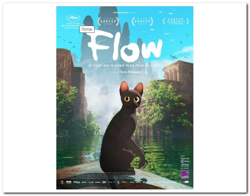 Полнометражный анимационный фильм "Поток". Или "Течение", или "Flow", или "Straume" на латышском, поскольку снят в Латвии. А также ещё в Бельгии и Франции. Мне не понравился, вряд ли буду ещё раз пересматривать. Сейчас расскажу, почему.