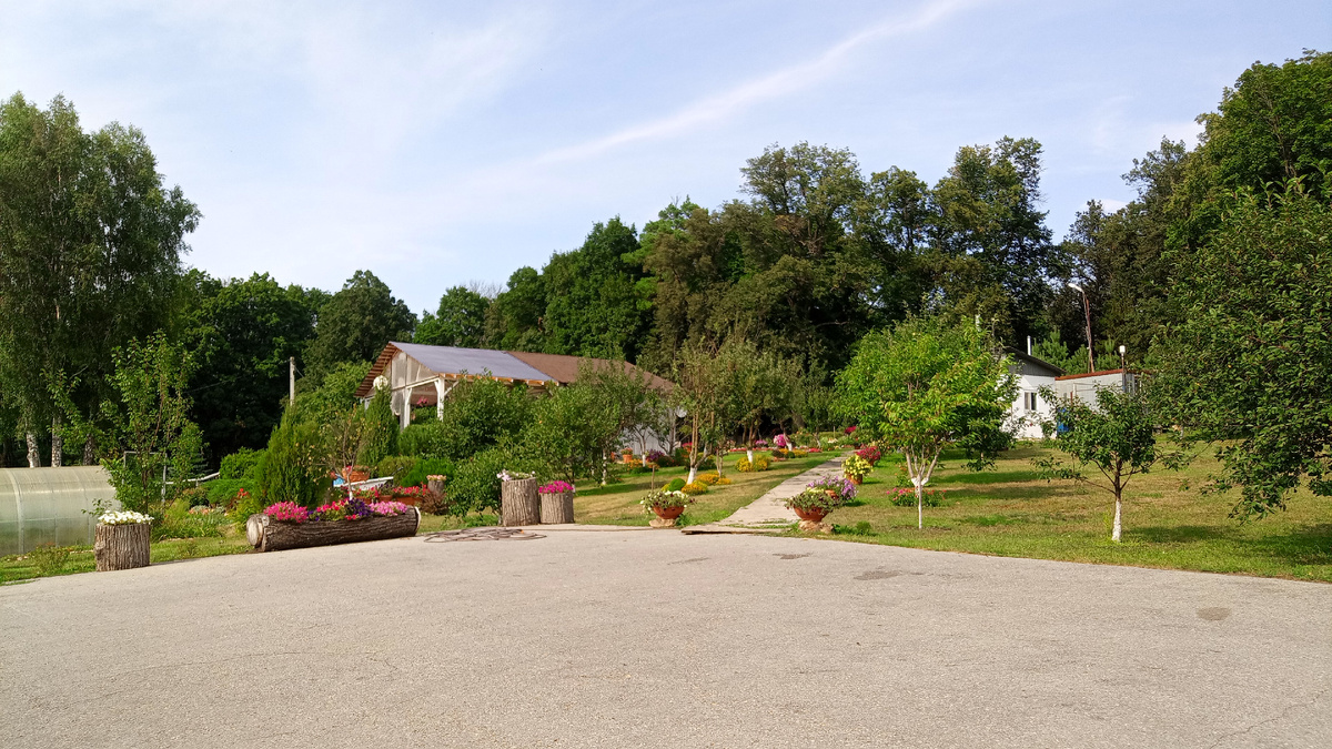 Когда вьезжаете на территорию парка, справа от дороги стоит ухоженный домик. Мы предположили, что это гостевой дом, где люди, приезжающие в парк, могут остановиться. Решили наведаться туда и все разузнать. У домика есть небольшая стоянка для транспорта. На стоянке разместился пустующий киоск. К дому ведет дорожка. Недалеко вдоль проезжей дороги высажены туи. Прошлись мы по дорожке к дому. Территория вокруг вся в клумбочках, цветочках и милых садовых фигурках. Стоит теплица, высажены молодые фруктовые деревья. Можно ходить и фотографироваться прямо в каждом уголке, настолько все уютно и красиво. Только у домика мы никого не видели. На доме висит телевизионная тарелка и нет ни вывески и никаких опознавательных знаков. Ходили, ходили вокруг и около, зашли с другой стороны. Увидели большую веранду, на ней стоят столик и кресла. Далее вход в основное помещение. Но никого нигде не было, и стучаться мы постеснялись. Может быть, все только обустраивается и гостевой дом еще не работает. Чуть