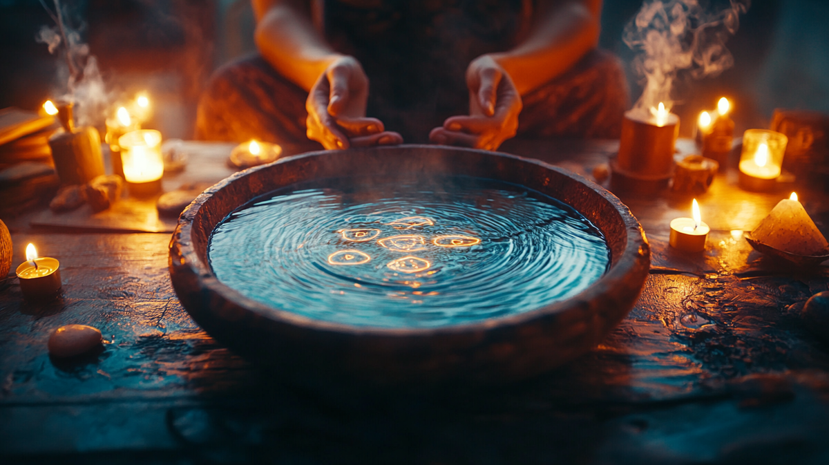 В этом методе гадатель наливает воду (часто собранную при полной луне) в миску. Затем он смачивает пальцы или специальную палочку водой и проводит по краям миски, считывая её звучание.