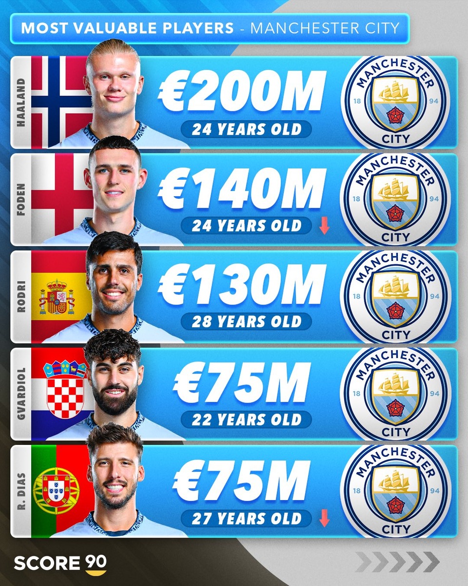 После последнего обновления трансферной стоимости футболистов Премьер-лиги от Transfermarkt «Ман Сити» подешевел больше остальных английских клубов. Все же один из двух самых дорогостоящих игроков мира выступает за «горожан» – речь об Эрлинге Холанде, чья трансферная стоимость оценивается в 200 млн евро, как и стоимость Винисиуса из «Мадрида». Портал Score90 составил топ-5 самых дорогих футболистов клубов большой шестерки Премьер-лиги, рейтинг собран на основе данных Transfermarkt. «Манчестер Сити» «Арсенал» «Челси» «Ливерпуль» «Тоттенхэм» «Манчестер Юнайтед» Все футболисты оправдывают свою оценочную трансферную стоимость? Transfermarkt обновил стоимость игроков АПЛ. Наибольший рост у футболиста «Челси», «Сити» подешевел больше остальных Самые дорогие январские трансферы. В топ-5 – переход Мудрика в «Челси», на первом месте подписание «Барсы» Лучшие игроки 2024 года по версии Opta. В топ-10 сразу пять представителей Бундеслиги, Родри лишь восьмой