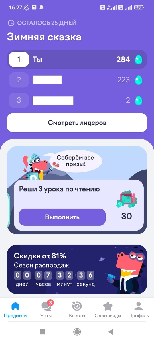 Зарегистрировали его там от школы, когда в сентябре был первый карантин с дистанционным обучением. Юре очень понравилось заниматься, особенно увлёк соревновательный момент - хотелось набирать больше баллов и быть первым. Но бесплатные возможности ограничены 20 заданиями ежедневно.