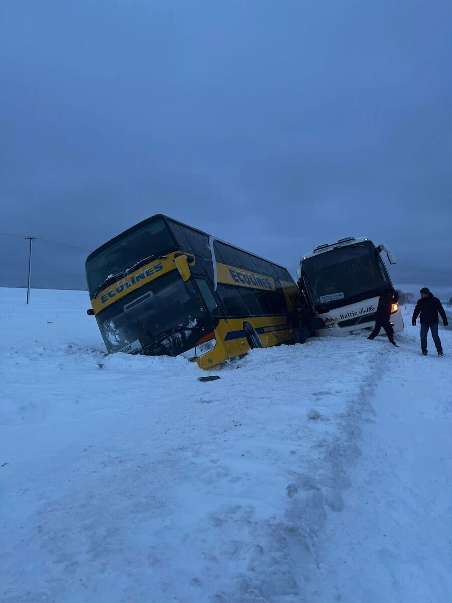 Обильные снегопады и гололед привели к происшествию на трассе Е-20. Сразу три пассажирских автобуса, следовавших из Таллина в Петербург, съехали в кювет и застряли в придорожных сугробах, пишет издание «Петербург 2».