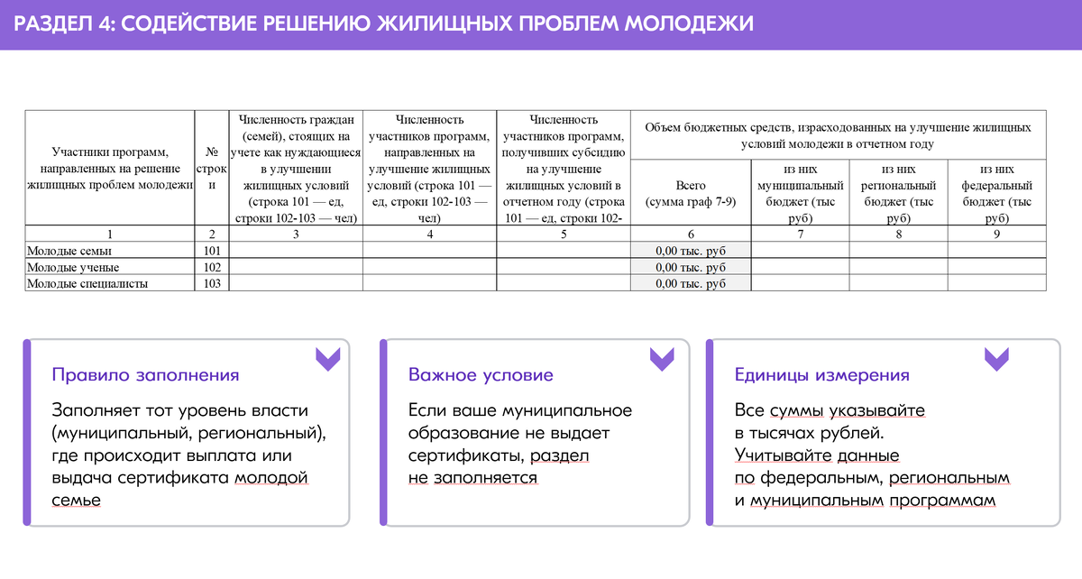 Раздел 4 раскрывает направление молодежной политики по жилищной поддержке молодежи. На федеральном уровне действует программа "Обеспечение доступным и комфортным жильем и коммунальными услугами граждан РФ". В рамках этой программы молодые семьи могут получить социальную выплату на приобретение жилого помещения (в том числе по договору участия в долевом строительстве) или создание объекта индивидуального жилищного строительства. Финансирование программы осуществляется из трех источников: федерального, регионального и местного бюджетов. По установленному в инструкции правилу информацию о результатах реализации программы в форму № 1-молодежь вносит орган, на чьем уровне осуществляются выплаты (выдача сертификатов) молодым семьям (муниципальное образование либо субъект Российской Федерации). Если вносят муниципальные образования, регион осуществляет контроль общей суммы и обращает внимание муниципалитетов на допущенные ошибки в случае их обнаружения. Чаще всего ошибки возникают из-за нев