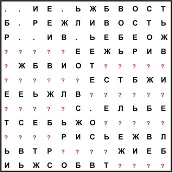 ОТВЕТ: Один из возможных путей решения(строка колонка символ правило): 22е1 15е3 11л3 12р1 36т3 32л3 33с1 62о3 61в3 65е3 63л3 43о3 41с3 51е3 64ь3 66р1 b6е2 7aт3 7bр3 77б3 83в3 a3е2 85т3 45б3 b5с2 42т3 44л1 82и3 a2б2 84о3 a4т2 a1о1 81ж2 87р1 b7л2 b8о1 78и3 79с3 7cо1 9cр3 5cс3 ccе2 98л3 58р2 59е3 5aл3 5bь1 99и3 c9р2 9bе3 9aв1 caе2 cbл2 Контрольные слова: СТОЛБ РЕЛЬС ВОЛЬЕР БИСТРО ЖИВОТ ЛИВЕР ОБЕТ СЕЛО РЕЛЕ СЕВ