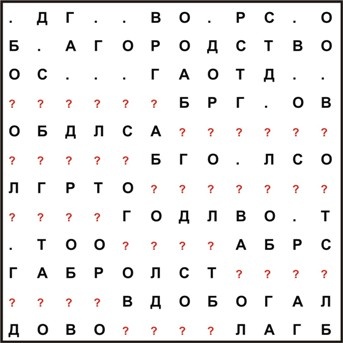 ОТВЕТ: Один из возможных путей решения (строка колонка символ правило): 22л1 18а3 14б3 34в3 3cр3 42о3 4aо3 5cг3 63т3 69д3 77в3 7aо3 8bб3 3bл3 1bт3 11о3 15л1 33о3 35б1 5bо3 58в3 59о3 5aр3 57т1 aaв2 7bд3 abо2 7cа3 acд2 a9о1 79б2 83с3 43л3 b3о2 84а3 64о3 81р3 82о1 91в3 61а3 65р3 62в1 b2р2 95д3 96о3 76с3 78о1 46т3 c6о2 41с3 b1т2 b4с1 44д2 45а1 c5т2 97л3 98г1 c7р2 c8с2 Контрольные слова: СОЛДАТ ТВОРОГ АВТОР СВОБОДА РОСА ДОЛГ ОВОД ТРОС ТОРС