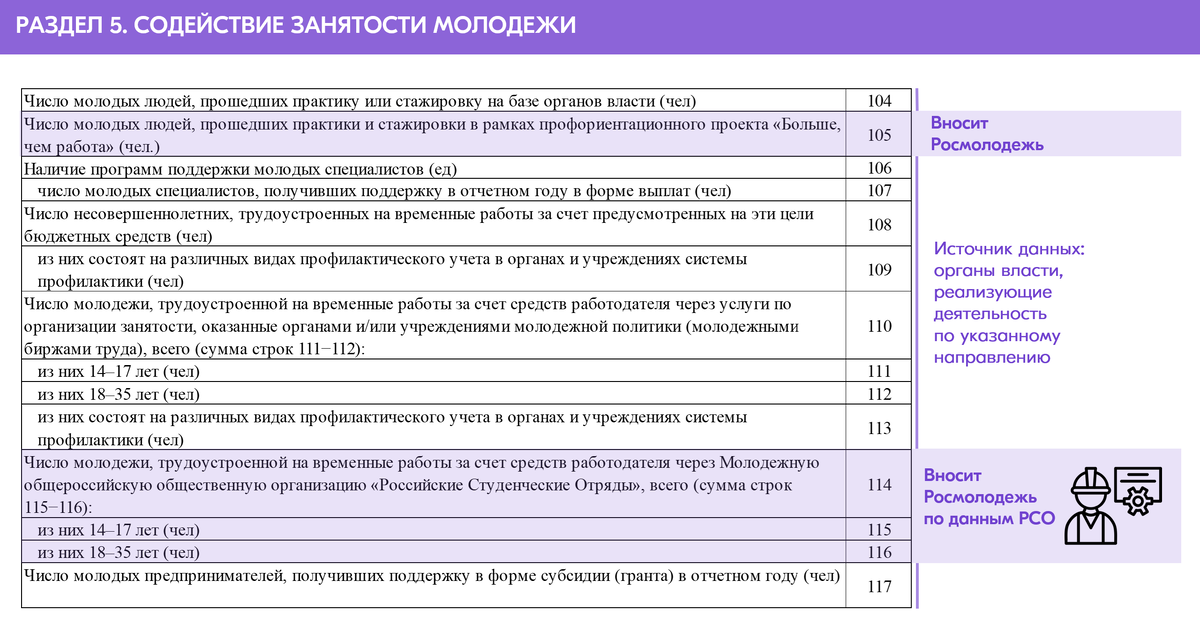 Раздел 5 аккумулирует данные в сфере муниципальных, региональных и федеральных мер поддержки занятости молодежи. Шаг 1. Запросите у органов власти своего уровня информацию о числе молодых людей, прошедших практики и стажировки в органах власти в течение отчетного года, для строки 104. Комплексно такие данные могут быть у подразделения, отвечающего за работу с кадрами. Шаг 2. Для строк 106 и 107 запросите у органов власти своего уровня информацию о наличии и результатах действующих на вашем уровне программах поддержки молодых специалистов, финансируемых из бюджета вашего уровня (кроме жилищных программ). Количество программ в строке 106 указывается в соответствии с числом действующих нормативных актов органов власти, регламентирующих меры поддержки. В строке 107 указывается число молодых специалистов, получивших поддержку в отчетном году. Учету подлежат только те программы, которые приняты органами власти того уровня, на котором формируется отчет (не только молодежная политика, любой пр