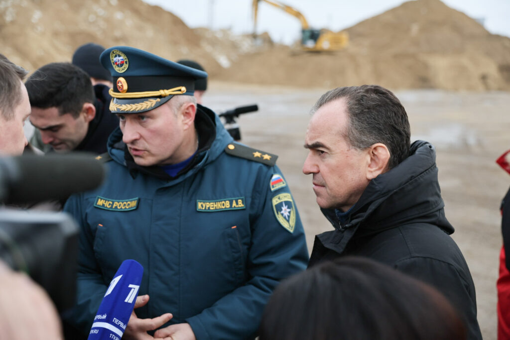 Глава МЧС России Александр Куренков и губернатор Краснодарского края Вениамин Кондратьев 12 января посетили временную площадку в хуторе Воскресенском, куда свозят собранный с пляжей Анапы загрязненный мазутом песок.