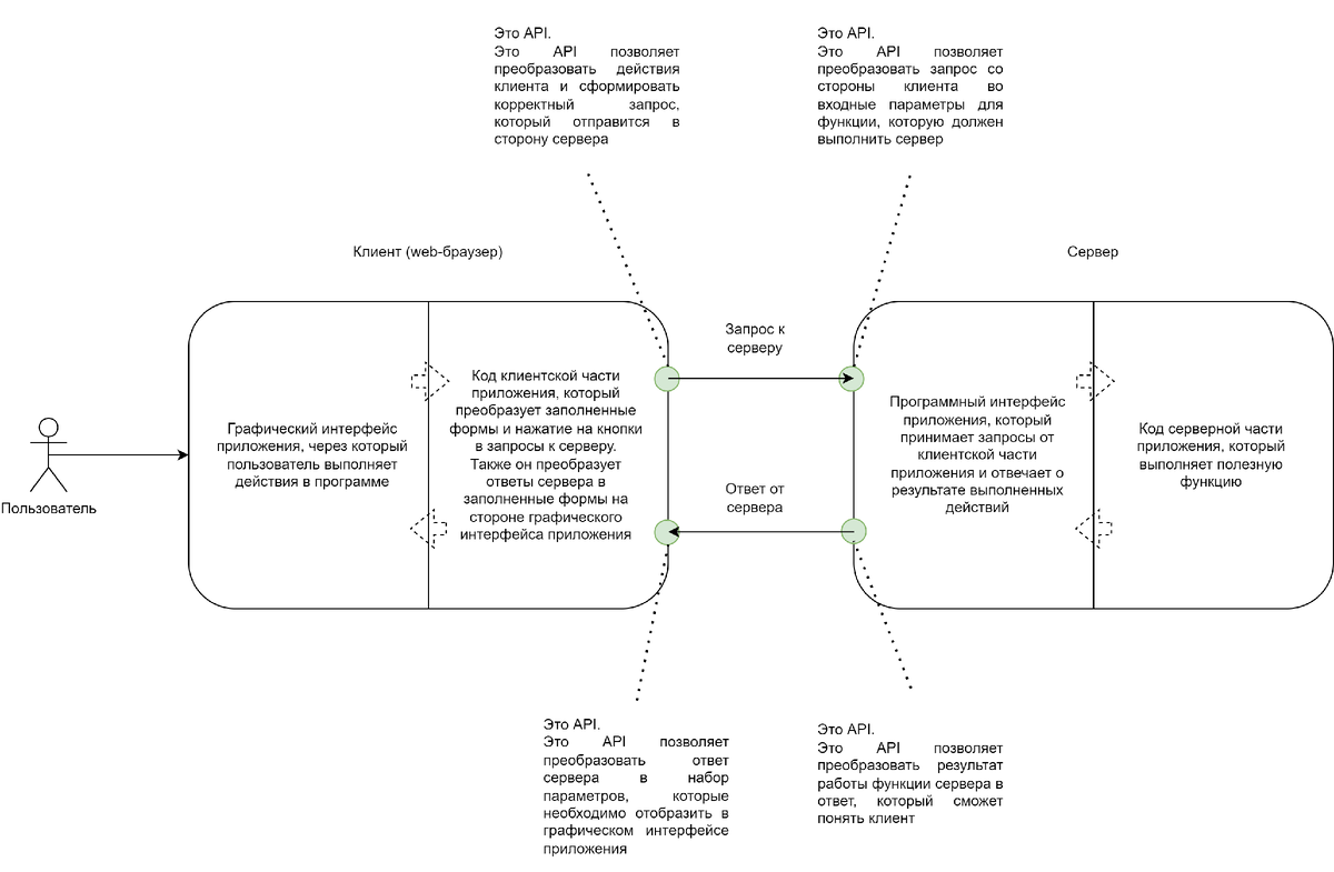 Из главы про клиент-серверную архитектуру мы помним, что в этой архитектуре еще присутствует база данных, а также что клиент – это не всегда web-браузер. Более того – не в каждом взаимодействии на запрос к серверу будет формироваться какой-то ответ (есть такое понятие, как асинхронное взаимодействие). Давайте рассмотрим эту более сложную картину и отобразим на ней потенциальные программные интерфейсы приложения: