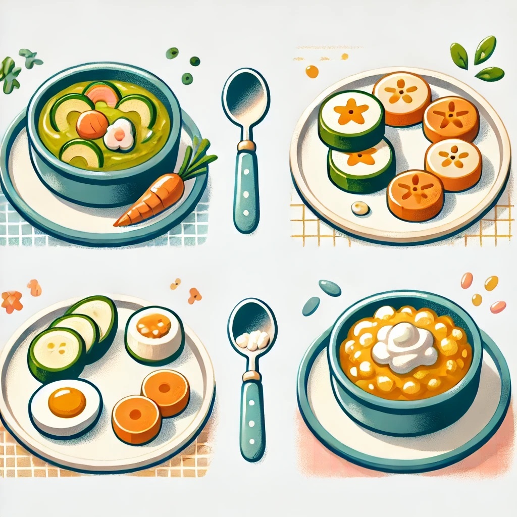 Готовить на воде или грудном молоке/смеси, без сахара и соли. - Овощи:Кабачок, цветная капуста, брокколи, тыква, морковь.