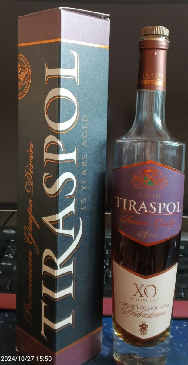 Коньяк «Тирасполь» приготовлен к 100-летию винно-коньячного завода «KVINT» и 205-летию города Тирасполь по классической технологии из высококачественных коньячных спиртов, выдержанных в дубовых бочках не менее 15 лет. Гармония, прекрасно развитый букет и необыкновенная мягкость еще более подчеркивает его изящество. На международных конкурсах награжден кубком Гран-при и 12 золотыми медалями."