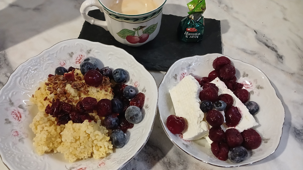 Завтракаем пшенной кашей с семенами льна и ягодами. Плюс пластовой творог с ягодами. К кофе - конфетка Мишки в лесу без сахара. После завтрака мы с мужем уехали во Владимир. С собой брала котлеты из индейки в лаваше с овощами, нарезанные яблоки, конфеты. Заварила в термокружке чай из яблок, облепихи, имбиря и корицы, и еще кофе в другой термокружке. Ужин по-быстрому: спагетти, сосиски Вкусвилл, овощной салат К сосискам - домашний кетчуп. В салате пекинская капуста, помидор, огурец, кукуруза, заправила ложкой майонеза и сметаной. Меню год назад