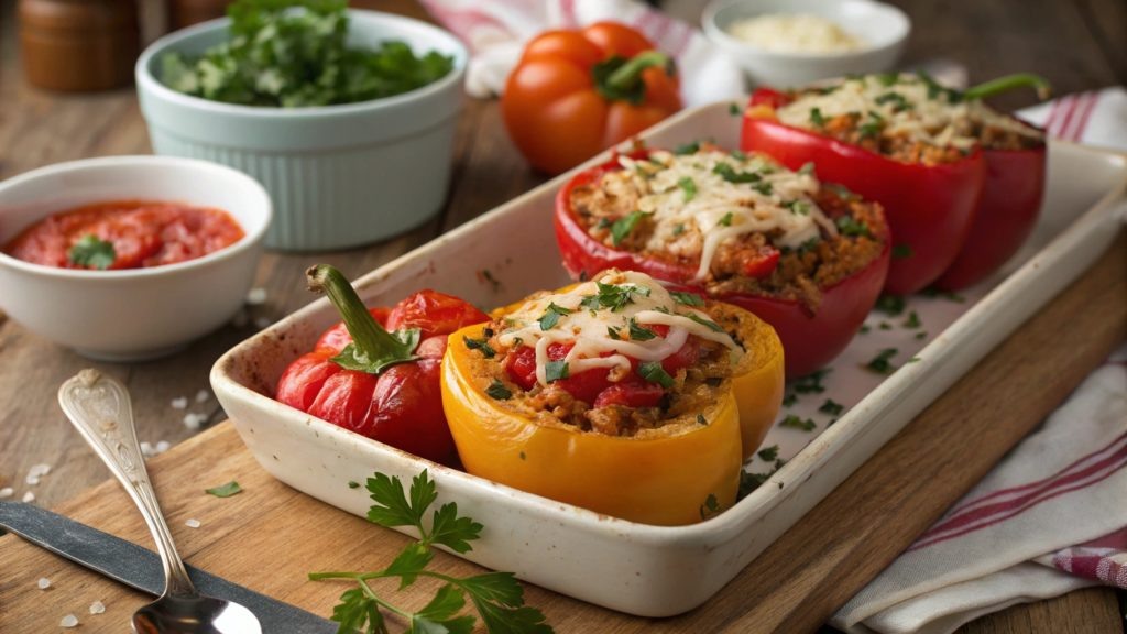 Запеченные фаршированные перцы с сыром и зеленью – это не только вкусное, но и очень красивое блюдо, которое отлично подойдет как для семейного ужина, так и для праздничного стола. Яркие перцы, наполненные нежным фаршем и ароматной зеленью, удивят ваших близких своим вкусом и видом. Не упустите возможность порадовать своих домашних этим восхитительным угощением! Замените говяжий фарш на куриный или индейку для более легкого варианта.Также можно добавить любимые специи или пряности, чтобы разнообразить вкус.Не стесняйтесь экспериментировать с другими начинками, добавляя овощи или бобовые! Общее время приготовления: 1 час 10 минут Время приготовления: 35 минут Время подготовки: 35 минут Рецепт рассчитан на 4 порции. Лучше всего подходят болгарские перцы среднего размера. Они: Выбирайте перцы: Совет: если перцы неустойчиво стоят на противне, срежьте немного нижнюю часть, чтобы выровнять их основание. Для начинки можно использовать разные виды сыра, в зависимости от желаемого вкуса: Совет:
