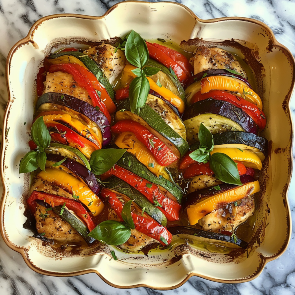 Хотите совместить полезные овощи и сытное мясо в одном блюде? Рататуй с запечённой курицей — это идеальное сочетание ярких вкусов и нежного мяса. Это блюдо не только красиво выглядит, но и просто готовится! Нарежьте баклажан, цукини и помидоры кружочками. Болгарский перец нарежьте полосками, лук — кольцами. Куриное филе промойте и обсушите бумажным полотенцем. На сковороде разогрейте 1 ст. л. оливкового масла и слегка обжарьте лук и чеснок до золотистого цвета. Добавьте болгарский перец и тушите 3-4 минуты. На противень или в форму для запекания выложите слоями овощи и обжаренные ингредиенты, чередуя их. Поверх разложите куриное филе, натёртое солью, перцем, паприкой и прованскими травами. Полейте блюдо оставшимся оливковым маслом и накройте фольгой. Запекайте в разогретой до 180°C духовке 30 минут. Затем снимите фольгу и оставьте в духовке ещё на 10 минут, чтобы образовалась аппетитная корочка. Украсьте блюдо свежим базиликом и подавайте с кусочком свежего багета или рисом. Попробуйт