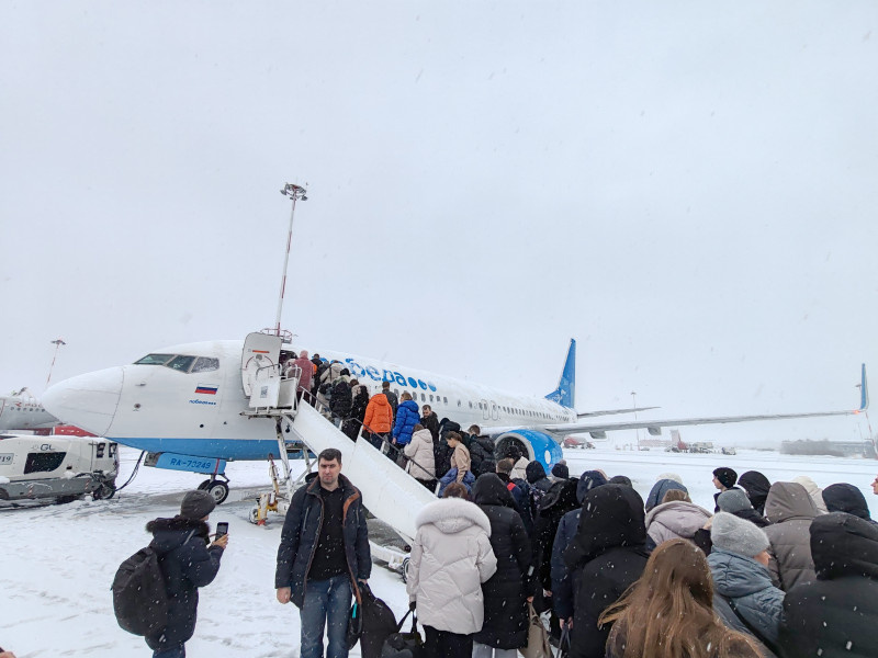 В самолёте было очень холодно. Печку никто не вызывал перед ТГО. Ледяные кресла. Но благодаря ВСУ постепенно стало теплеть. Посадка через один трап, а не два, как обычно у Победы. Видимо, несмотря на рекордные сборы, у аэропорта Пулково не хватает автобусов, трапов, спецмашин для уборки снега, снегоуборочных команд (этим можно просто платить нормальную зарплату, и они появятся).