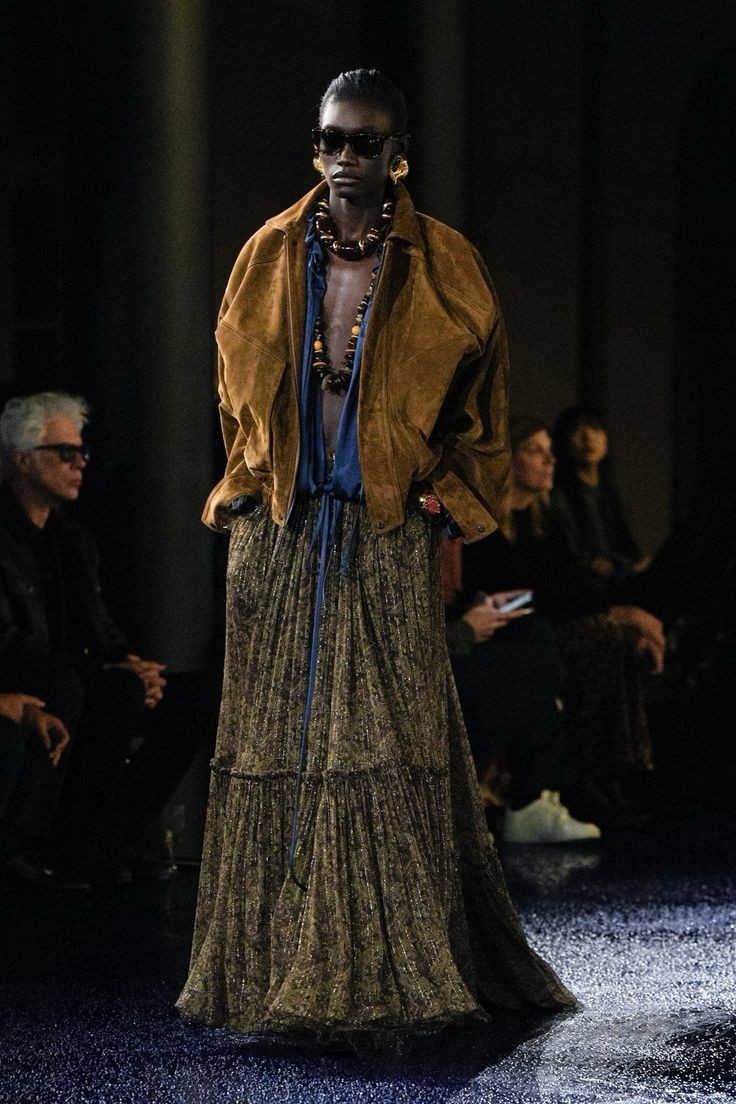 Эстетика свободного бохо с его роскошными вышивками и летящими силуэтами дополняется брутальными деталями байкерского стиля - обилием кожи и металлических деталей.