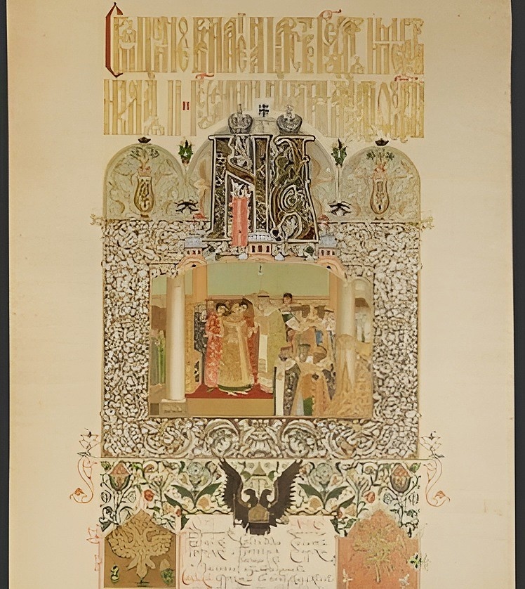 Меню торжественного обеда, состоявшегося в день вступления на престол императора Николая II и императрицы Александры Фёдоровны 14 мая 1896 года, выполнено по рисунку Виктора Васнецова. Художник к тому времени имел богатый опыт составления праздничных меню, в том числе для коронации Александра III и Марии Фёдоровны в 1883 году. Обед проходил по традиции в Грановитой палате Московского Кремля после завершения обряда коронации. На нем присутствовали приглашенные лица из числа российских подданных, иностранные представители располагались в других залах дворца. Меню представляло собой лист в виде древнерусского свитка. По верхнему краю листа древнерусской вязью напечатан текст: «Священное венчание на царство государя императора Николая II и государыни императрицы Александры Феодоровны». В верхней половине листа помещена орнаментальная заставка со сценой венчания на царство Михаила Фёдоровича. Изображен момент, когда митрополит Казанский Ефрем возлагает на голову царя шапку Мономаха. Над сце