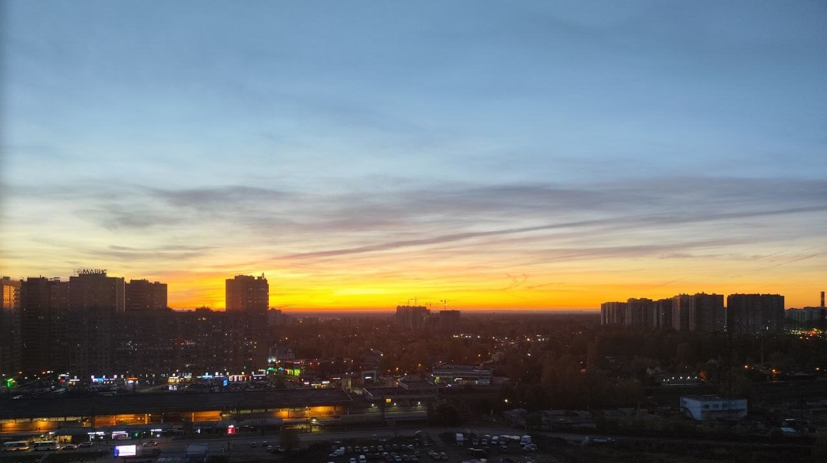 Осень в Петербурге – время переменчивое. Если на прошлой неделе мы могли наслаждаться относительным теплом, то теперь по утрам всё чаще пробирает холод. Но что не меняется — это активность на строительных площадках. В Западном Мурино каждое утро начинается с солидного набора техники и звуков стройки. А сегодня, 19 октября, когда на улице довольно свежо, мы можем наблюдать особенно яркий и красивый восход солнца над местностью. Посмотрите, как красиво восходит солнце. Вот тут, внизу и прокладывается важная транспортная артерия — обходная магистраль.