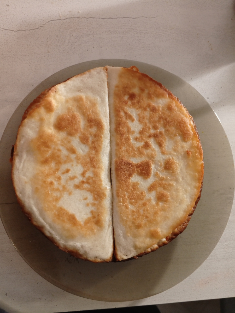 Покупаем лепешку, либо лаваш и твёрдый сыр Натираем сыр на терке, выкладываем лепешку и на половину лепёшки равномерно насыпаем сыр после чего накрываем второй половиной лепешки, что бы получилась форма полумесяца. Далее нагреваем сковородку и наливаем немного растительного масла, кладем лепёшку на сковородку и обжариваем 2-3 минуты с двух сторон. Потом аккуратно достаем лепешку и даем ей остыть. Приятного аппетита 😋