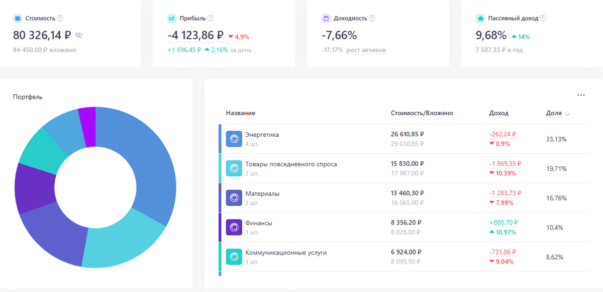 Ну вот уже и почти середина зимы.Ничего из дивидендов пока не пришло. Значит одно пополнение из заначки на сумму 1250 рублей. Новостей каких-то хороших нет, да и плохих вроде тоже. Новостей от Магнита нет. Утвердили они дивиденды или нет, я не в курсе. Но надеюсь на лучшее. Как и планировал купил 1 лот ( 10 акций ) по цене 90,89р. Всего у меня в портфеле уже 110,31р. Я так понимаю, что зимой от этой компании выплат не будет. Ну зато летом, я надеюсь, хорошие дивиденды будут. На данный момент мой портфель выглядит так: А ведь уже на счет больше 80 тысяч. Растет. Доходность пока минусовая, но я уверен, что будет плюс и неплохой. Прогноз по дивидендам выглядит так: Из прогнозов пропала выплата Магнита. Поэтому с покупкой прогноз только меньше стал. Надеюсь с Магнитом все решится в мою пользу. На следующей неделе я планирую купить пару акций Газпромнефти. Цена на нефть много выросла, рубль будет постепенно слабеть. Прибыль у компании будет.