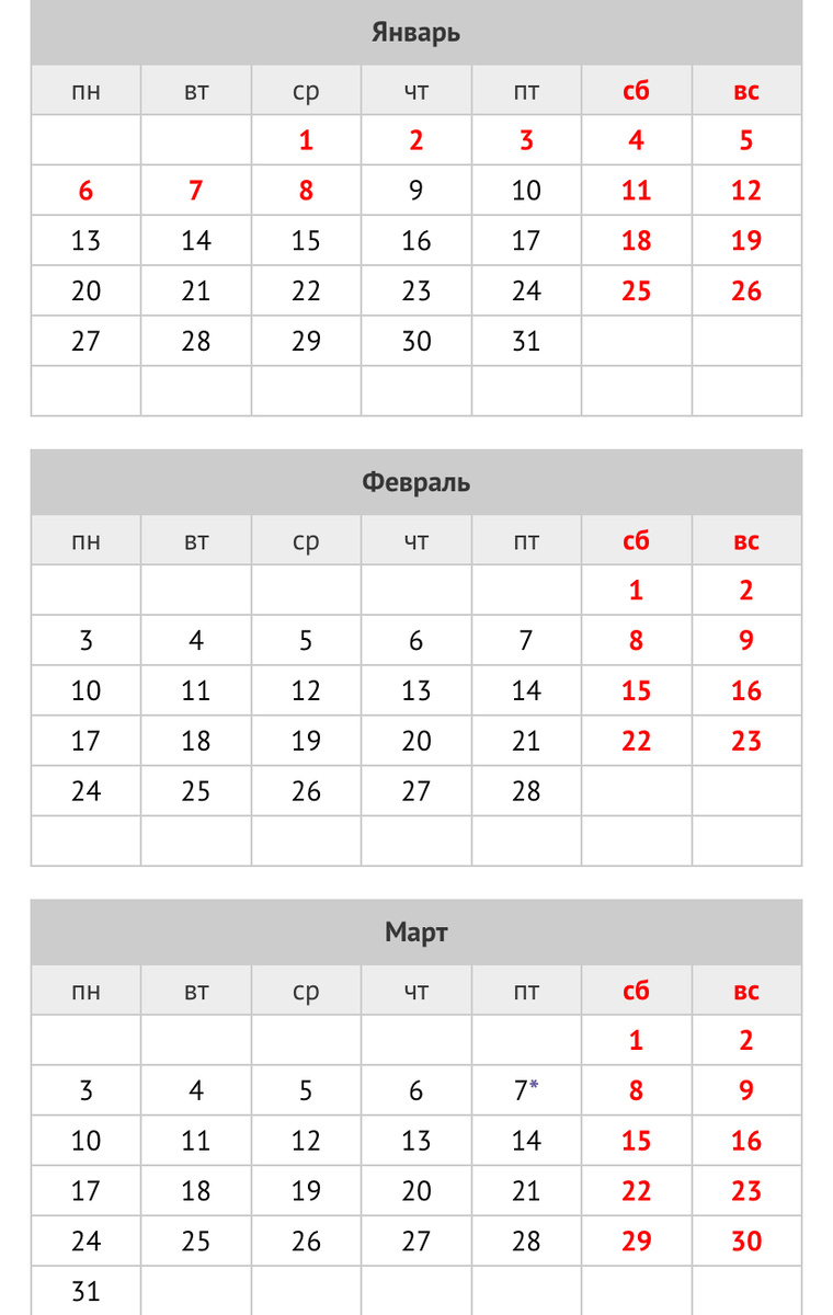 С сети опубликовали календарь на 2025 год, с учетом пятидневной рабочей недели. Статьей 112 Трудового кодекса Российской Федерации установлены следующие нерабочие праздничные дни в Российской Федерации: 1, 2, 3, 4, 5, 6 и 8 января — Новогодние каникулы; 7 января — Рождество Христово; 23 февраля — День защитника Отечества; 8 марта — Международный женский день; 1 мая — Праздник Весны и Труда; 9 мая — День Победы; 12 июня — День России; 4 ноября — День народного единства.