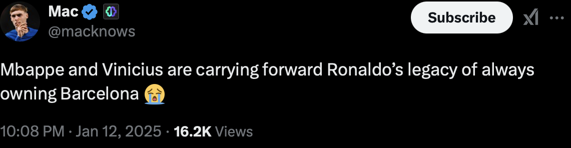 «Барселона» и «Реал Мадрид» бьются за первый трофей года – Суперкубок Испании. Килиан Мбаппе порадовал фанатов королевского клуба уже на пятой минуте, забив блестящий гол в своих лучших традициях. А вот потом «Барса» включила уровень «Кошмар». Для соперника. Левандовски, Рафинья, Ямаль и Бальде – четыре гола за тайм в ворота Тибо Куртуа. Отправимся в соцсети. 💭 «Рафинья просто Бог на фоне Винисиуса». 💭 «Ямаль обязан получить «Золотой мяч раньше Винисиуса». После гола «Реала»: 💭 «Мбаппе и Винисиус продолжают наследие Роналду – владеть «Барселоной». После первого тайма: 💭 «Что? Мы тебя не слышим». 💭 «Левандовски уже забил больше голов, чем Винисиус в прошлом сезоне. Но бразилец выиграл больше трофеев. А по мнению фанатов «Реала» трофеи не делают Месси лучше Роналду. Хм...» 💭 «Рафинья уже догнал Винисиуса по количеству голов за весь прошлый сезон. Даем «Золотой мяч»? 💭 «Винисиус должен придумать, как обвинить Гави в провокации. Мы не можем играть так во втором тайме». 💭 «Боюсь, чт