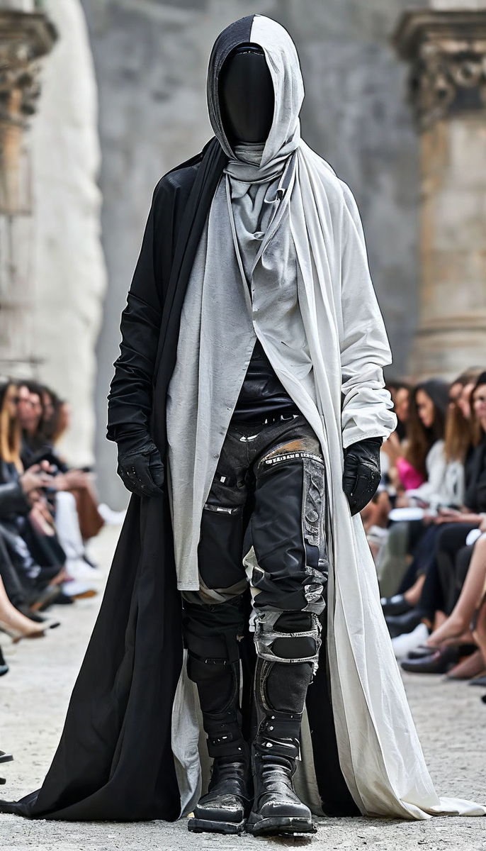 Мне стало интересно как нейросеть покажет показ в 2050 году . Я обратилась к ней с просьбой составить интригующие и необычные облачения в сочетании черного и белых цветов , и вот что из этого вышло