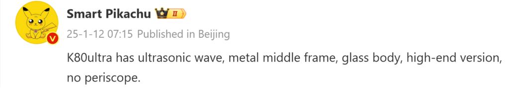 В этом году Redmi планирует расширить серию K80, выпустив флагманскую модель Redmi K80 Ultra. По имеющимся данным, это может быть первый топовый смартфон Redmi, который выйдет во второй половине этого года. Слухи о K80 Ultra уже начали появляться на просторах Интернета. Недавняя утечка информации показала, что модель Ultra будет оснащена значительно улучшенной батареей. Теперь новая утечка, предоставленная информатором Smart Pikachu, раскрыла ключевые подробности о Redmi K80 Ultra. Утечка показывает, что Redmi K80 Ultra будет иметь стеклянный корпус и металлическую рамку. В то время как Redmi K70 Ultra был оснащен сканером отпечатков пальцев оптического типа, K80 Ultra, как предполагается, будет оснащен ультразвуковым сканером отпечатков пальцев. Утечка показывает, что у Redmi K80 Ultra не будет перископической камеры, что неудивительно, учитывая, что он разработан как телефон, ориентированный на высокую производительность, а не на фотографические возможности. На вопрос об объеме аккум