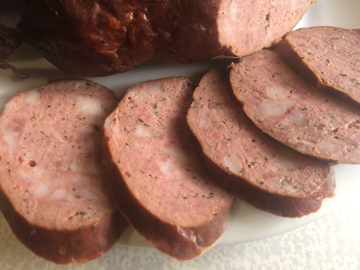 У каждого салата есть свои предпочтения. Вот, к примеру, Оливье можно сделать с любой колбасой. Но с детства предпочтение отдавалось Докторской, той, что была по 2-90 руб. Какая она была нежная и ароматная! В предшествующие годы я вообще перешла на замену колбасы мясом птицы. Вкуснее всего с мясом гуся или индоутки. Но и с индейкой тоже оригинальный вкус. Только мясо курицы не особо люблю в Оливье - как-то уж совсем упрощённо получается. А в этом году опять вернулась к колбасе в Оливье, раз уж я всё-таки освоила её приготовление. Только не из магазина, а к своей, домашней: свинина + гусиная грудка в равных пропорциях. Специально оставила палочку колбасы без копчения для Оливье.