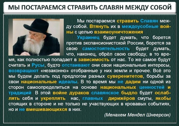 Так, в своей речи, сей Изя, ничуть не смущаясь и не скрывая намерений, с завидной для многих откровенностью, озвучивает программу уничтожения славян. И русских в частности. Программу уничтожения народов!!! Реализацию которой, возможно, мы и наблюдаем сейчас... Путем разделения, раздрая и стравливания славян между собой, предварительно перед этим захватив деньги, власть, телевидение и прочие СМИ...