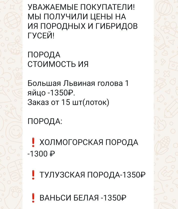 Нам тут на днях прайс лист кинули. Нам - птицеводам любителям. Сказать, что я ошеломлена, это ничего не сказать. Нахожусь в недоумении просто задратыми ценами вверх. Нет, я все понимаю или может не все, да цены растут, но... В общем цена одного инкубационного яйца гуся стоит 1350, и я не ошиблась с нулем именно тысячу триста пятьдесят рублей. И никто не дает 100% гарантии на оплод. Не факт, что из всех 15 яиц вылупятся гусята, может быть по всякому. То есть я должна это яйцо купить, в инкубаторе его вывести, вырастить этого гусенка в полноценного гуся. Я даже боюсь считать сколько это будет стоить. Тогда вопрос какая будет цена тушки, чтобы фермер окупил все затраты на вывод, выкорм и сам получил прибыль, это ведь тоже не за просто так делается. Мне как-то сразу и перехотелось уже гусиным царством заниматься. На февраль, мы кидали предварительный заказ на уток тяжелой линии, цены мы еще не знали. И я вот посматриваю на цену гусей и в голове прокручиваю, сколько это может стоить 400, 5