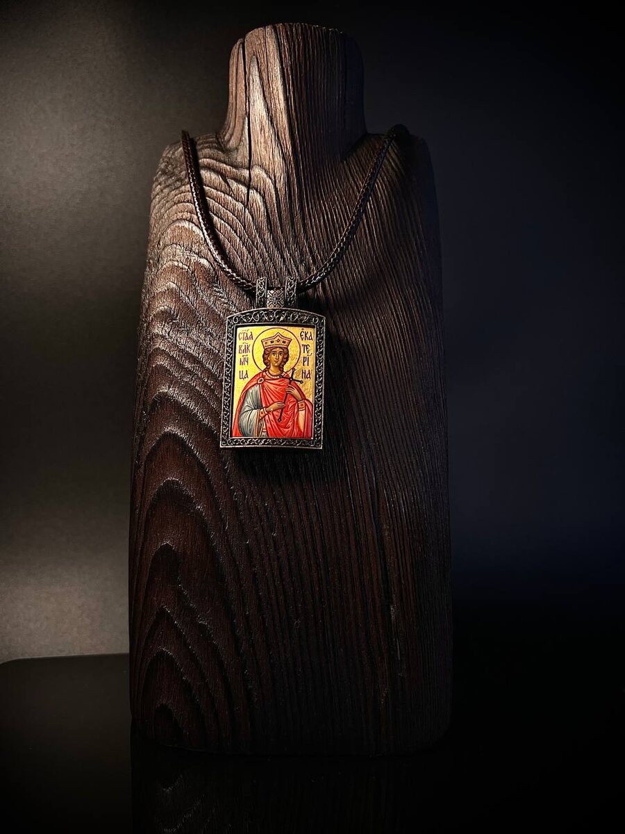 Нательная икона мирница с образом святой влкмц. Екатерины Александрийской, в которую можно поместить миро, благословенный елей, святую воду или родную землицу. В честь этой святой мученицы освящают храмы по всему свету и во многих христианских конфессиях. В одном только Санкт-Петербурге можно встретить и православный храм, и католический костел, и лютеранский приход, и армянскую церковь, которые носят ее имя. Именем Св. Екатерины назван древнейший православный монастырь на планете, в обителе которого хранятся ее мощи. А в 1935 году Международный астрономический союз в ее честь назвал один из кратеров на Луне. Образ этой святой или символы, связанные с её муками, встречается в гербах множества городов: от Мурино в Ленинградской области - до Мёмбриса в Германии. В IX веке была составлена замечательная служба, которая до сих пор совершается в день памяти великомученицы Екатерины. Её же молитвами укрепи и нас, Боже. Мирница с образом Святой Екатерины написана в миниатюре на кленовой дощ
