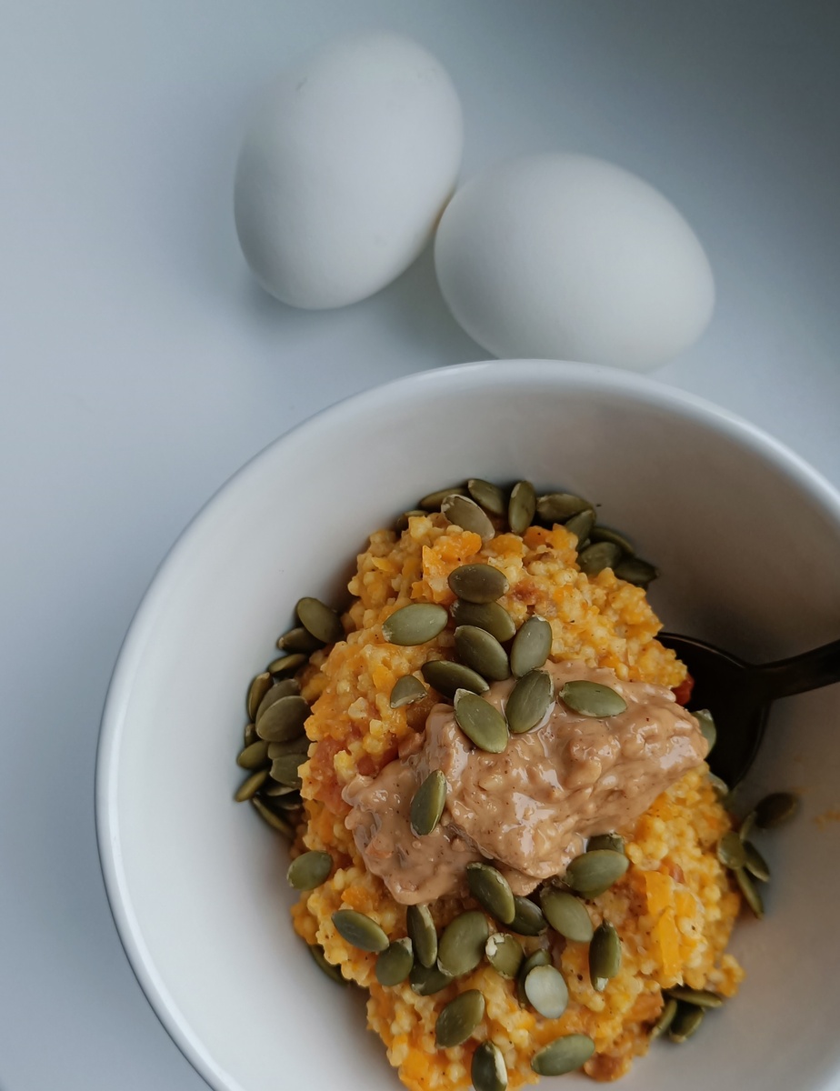 - Тыквенная каша с курагой, кокосовым урбечом и корицей + арахисовая паста + тыквенные семечки