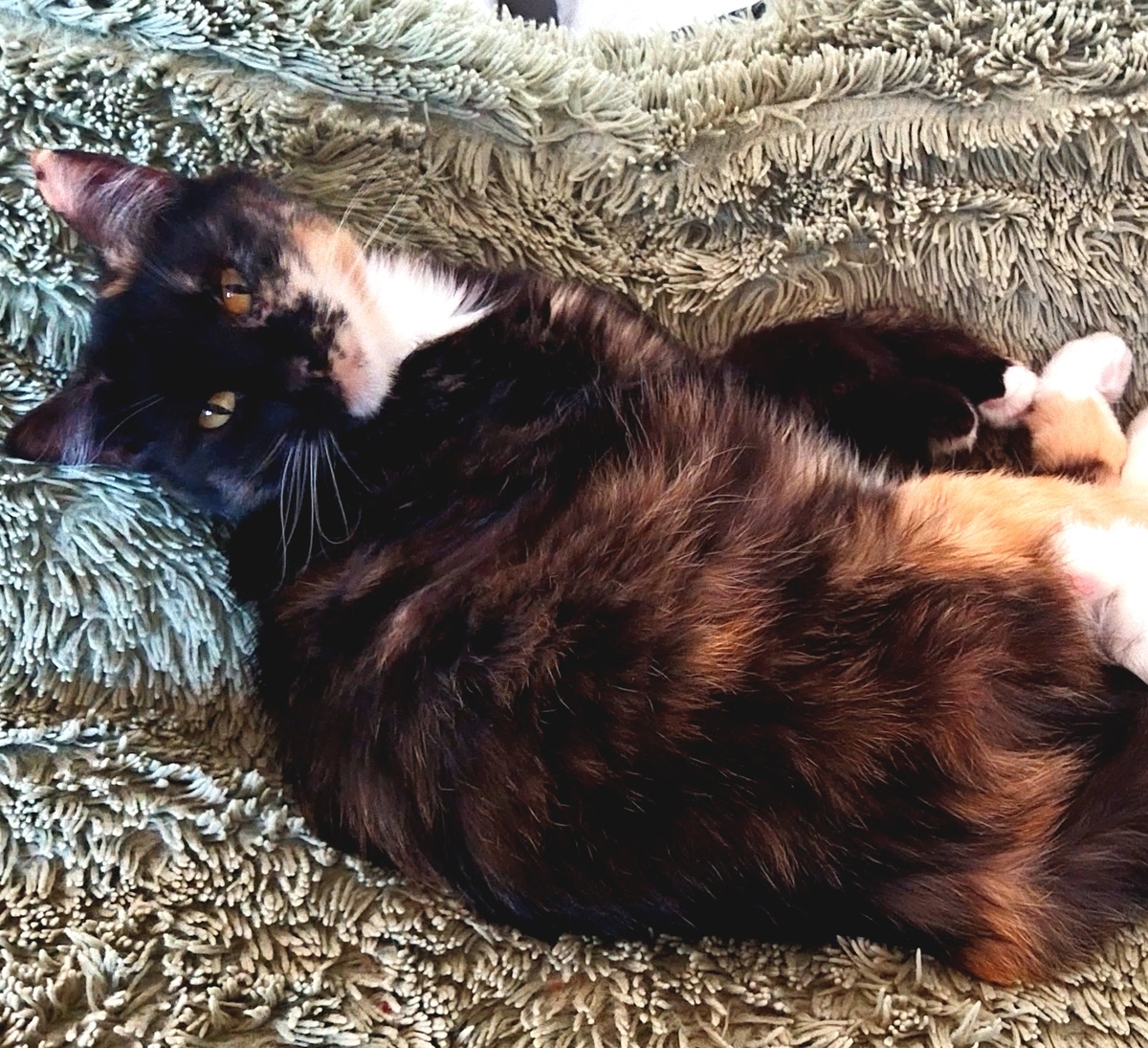 Котя - ласковая трусиха , до сих пор считает себя дочкой Мони , хотя ни когда ею не была. Я забрала ее из большой кошачьей семьи . Все время наровит залезть на руки 😺