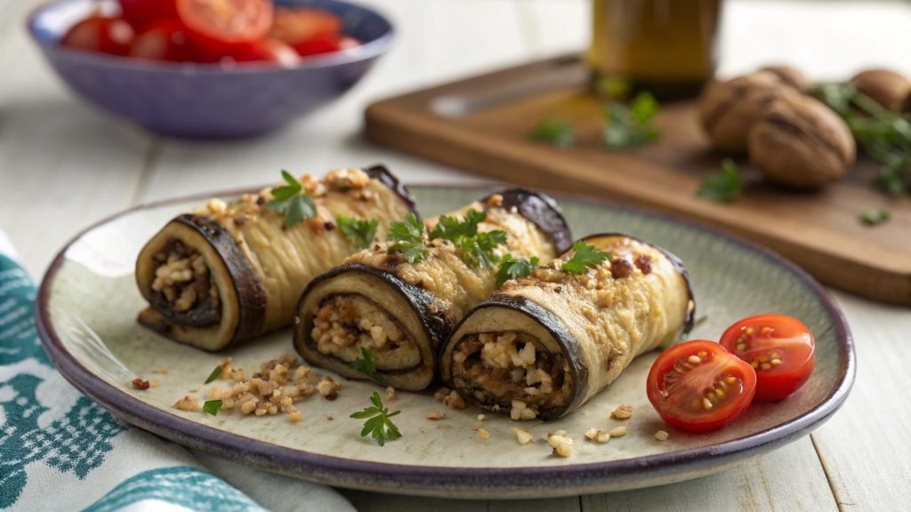 Рулетики из баклажанов с орехами — это невероятно вкусное и яркое блюдо, которое подчеркнет любой семейный ужин или праздничный стол. Сочные баклажаны, наполненные ароматными орехами, подарят вам богатый вкус и сделают прием пищи незабываемым. Эти рулетики можно подавать как горячими, так и холодными, что делает их универсальным угощением для любого случая! Чтобы сделать рулетики более острыми, добавьте в начинку немного красного перца.Также можно заменить грецкие орехи на кешью или миндаль для разнообразия вкуса. Общее время приготовления: 1 час 10 минут. Из них: подготовка — 30 минут, приготовление — 40 минут. Рецепт рассчитан на 6 порций. Баклажаны могут горчить из-за содержания соланина. Чтобы избавиться от горечи: Совет: современные сорта баклажанов обычно менее горькие, поэтому этот шаг можно пропустить, если у вас сладкие баклажаны. Ореховая начинка — главный элемент блюда. Вот базовый рецепт: Совет: начинка должна быть густой, чтобы она не вытекала из рулетиков. Баклажаны можно