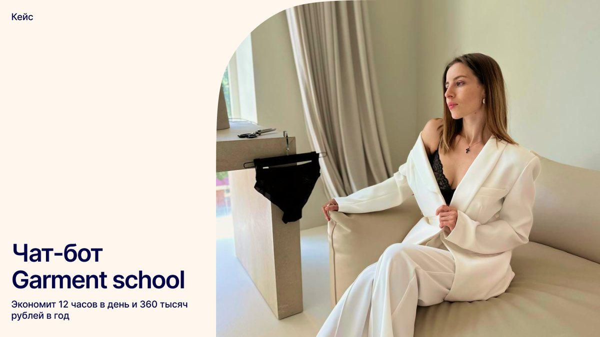 «Для меня бот стал открытием, даже не думала, что так можно. Зачем мне платить 30 000 администратору, если есть чат-бот за 990 рублей в месяц. Теперь людям не нужно писать в чат и ждать ответа — всю необходимую информацию можно узнать в боте. Я больше не сижу целый день в телефоне, а спокойно занимаюсь творчеством и развитием», — Виктория Салихова, основательница Garment school