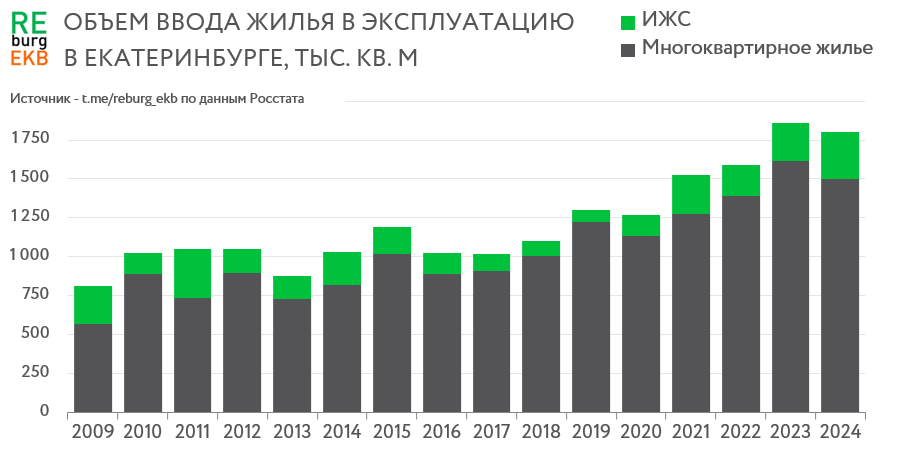 Предварительные данные за 2024 год показывают снижение объема ввода многоквартирного жилья. Но отмена льготной ипотеки здесь ни при чем. Администрация Екатеринбурга опубликовала предварительные данные по объему ввода жилья в эксплуатацию за 2024 год. В городе было построено около 1,8 млн. кв. м жилья. Из них 1,5 млн. кв. м в многоквартирных домах (МКД) и около 300 тыс. кв. м индивидуальных домов (ИЖС). Эта статистика полностью соответствует ожиданиям. Небольшое снижение ввода многоквартирных домов (показатель 2023 – 1,6 млн. кв. м) было предопределено непродолжительной инвестиционной паузой в 2022 году. В этот непростой год девелоперы заложили меньше проектов чем в 2021. Во многом именно эти дома определили объем ввода прошлого года. Но уже в 2023 году закладка новых проектов существенно выросла, поэтому показатели ввода МКД в 2025 году должны быть выше показателей прошлого года. А вот отмена "льготной ипотеки" и корректировка инвестиционной стратегии девелоперов скажется на вводе жил