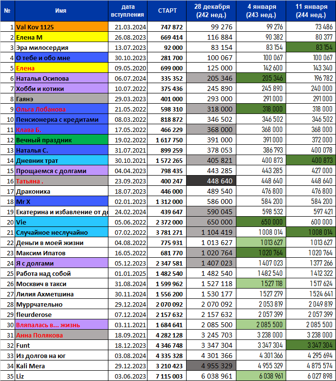 Привет всем! Мы продолжаем избавляться от груза в виде долговых обязательств. Наша общая цель - свобода от долгов. Но в то же время цель у каждого своя, у кого-то она совсем близко, а кто-то ещё в начале пути... Но дорогу осилит идущий, уж мы могли в этом убедиться на примере тех, кто уже завершил марафон. Так что мотивируемся, берем пример и... идём вперёд, к свободе! 1. Я всегда рекомендую считать накопления в зачет уменьшения суммы долга. можно даже отдельную копилку завести и назвать её "на кредит". И если у вас долг на 200 тысяч, а в копилке 120 тысяч, то можно смело писать, будто ваш долг 80 тысяч. Почему многие так не делают, считая будто это другое - мне не понять. Заставить никого я не могу, заглядывать в чужие кошельки не хочу, поэтому в этом плане всё останется как есть. Нравится человеку ползти черепашкой, пусть. 2. Думала об ограничении по времени, например три года. Но это слишком сложно, к тому же суммы и сроки у всех разные, нельзя же всех под одну гребёнку. 3. Было инт