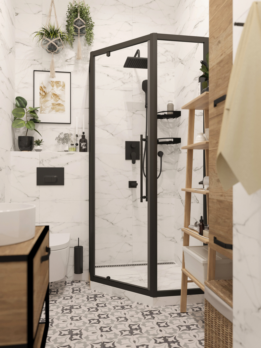 Так как у заказчиков есть восточные корни, я решила добавить в современное пространство этнических мотивов: напольная плитка с восточным рисунком и подвесы с комнатными растениями (они могут быть искусственными) - зелень хорошо оживляет интерьер, а сам держатель сделан в узелковой технике - макраме (отсылка к этнике). Стеллаж и плетённая корзина для белья становятся частью дизайна интерьера - не просто функционально, но и стильно и наполнено.