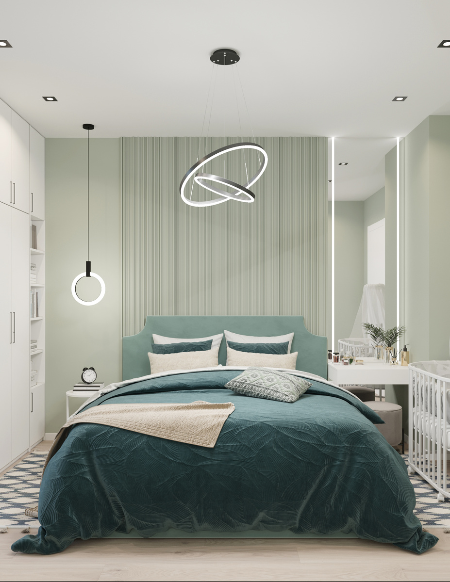Интерьер спальни получился лаконичным, спокойным и функциональным. В комнате есть всё необходимое для пары с грудным ребёнком: кроватка для новорождённого, есть место для пеленального комода, кресло, где можно посидеть с ребёнком или почитать книгу, шкаф с книжными полками, туалетный столик. На лоджии есть рабочее место и подвесное кресло для отдыха. В интерьере использованы различные сценарии освещения: пространство спальни получается более комфортным и уютным.