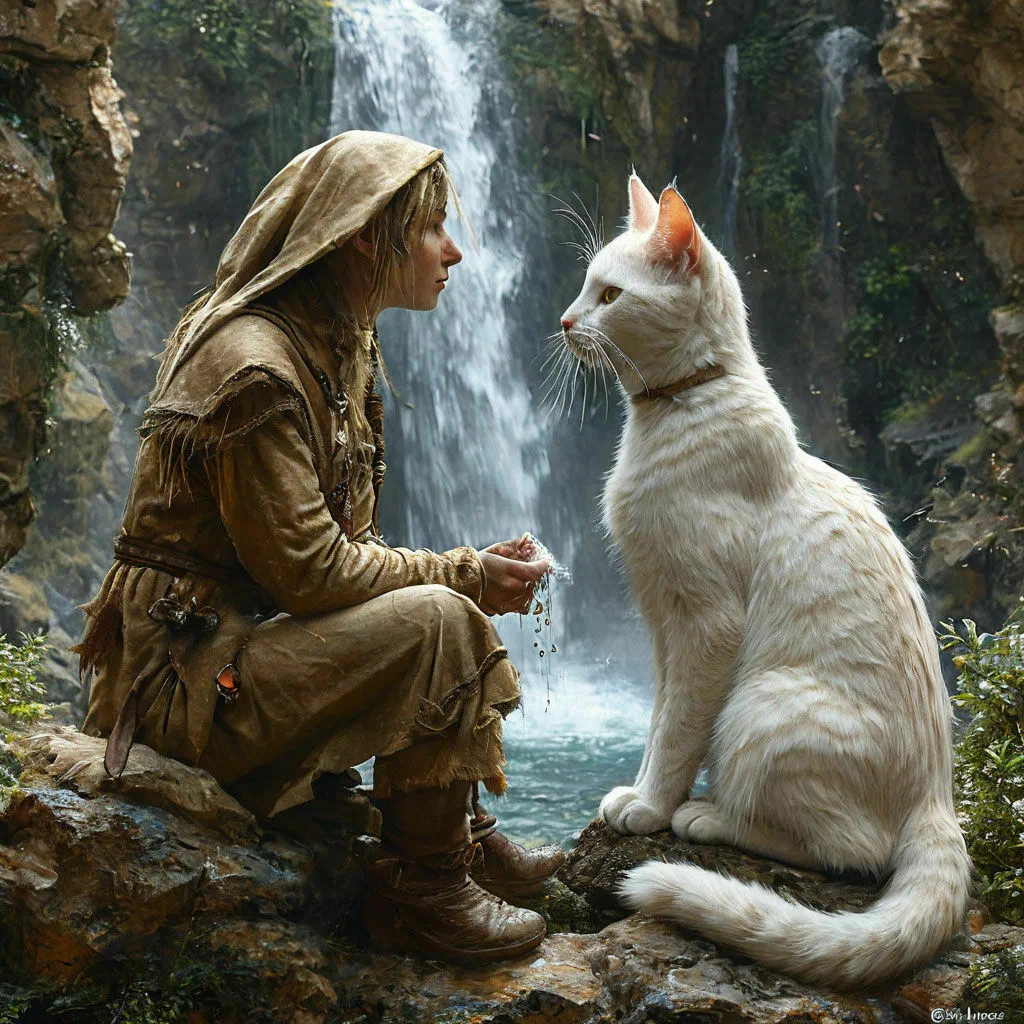 В далекой стране жила кошка по имени Д с мягкой шерстью цвета топлёного молока и зелёными глазами. Она была любопытной и однажды решила исследовать мир за пределами своего дома. Кошка вышла на улицу и увидела множество интересных вещей. Она заметила, как солнечные лучи играют на листьях деревьев, как птицы весело щебечут, а бабочки порхают с цветка на цветок. Кошка решила прогуляться по окрестностям. Она шла по тропинке, которая вела через лес. Д наслаждалась красотой природы и слушала пение птиц. Вдруг она услышала странный звук. Это был звук воды. Д. пошла на звук и вышла к небольшому водопаду. Она была поражена его красотой. Вода падала с высоты и создавала радугу в воздухе. Д долго сидела у водопада, наслаждаясь красотой природы. Вдруг кошка услышала, как кто-то зовёт её по имени. Она обернулась и увидела маленького эльфа, который сидел на камне у водопада. Эльф улыбнулся и пригласил Д разделить с ним пикник. Кошка с радостью согласилась. Они сидели у водопада и наслаждались вкусн