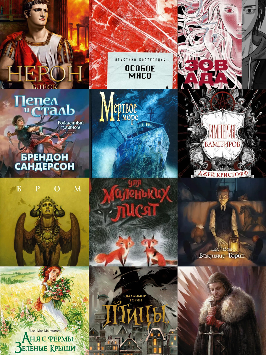 12 ЛУЧШИХ КНИГ 2024 ГОДА (по моему скромному мнению, разумеется😅) Нерон: блеск накануне тьмы - Маргарет Джордж Рожденный туманом: пепел и сталь - Брендон Сандерсон Потерянные боги - Джеральд Бром Игра престолов - Джордж Мартин Аня с фермы зеленые крыши - Люси Монтгомери Особое мясо - Анустина Бастеррика Мертвое море - Тим Каррэн Страшные истории для маленьких лисят - Кристиан Хайдикер Птицы - Владимир Торин Зов Ада 2 (графический роман) Империя вампиров - Джей Кристофф И гаснет свет - Владимир Торин (повесть)