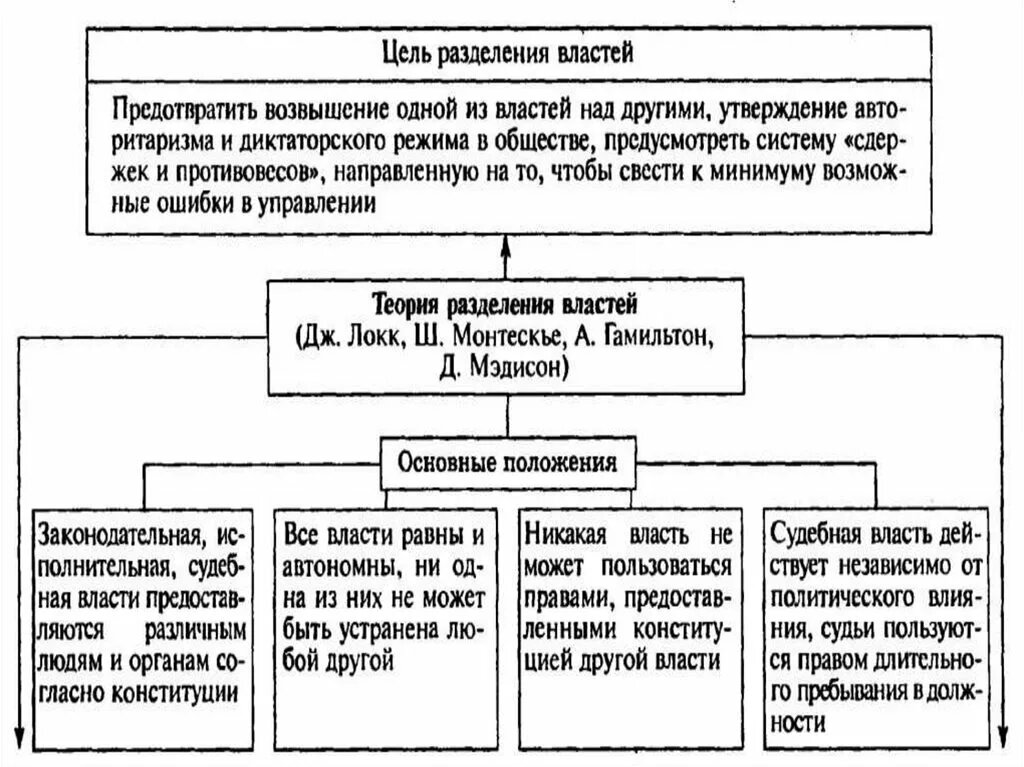 Ш. Монтескьё одним из первых начал задумываться о том, как избежать тирании и деспотии со стороны представителей власти в отношении общества, которые в то время переживали многие государства Западной Европы. В своём трактате «О духе законов» французский мыслитель пришел к выводу о необходимости разделения власти на законодательную, исполнительную, судебную ветви власти, которые будут существовать независимо и самостоятельно друг от друга и принадлежать разным государственным органам.