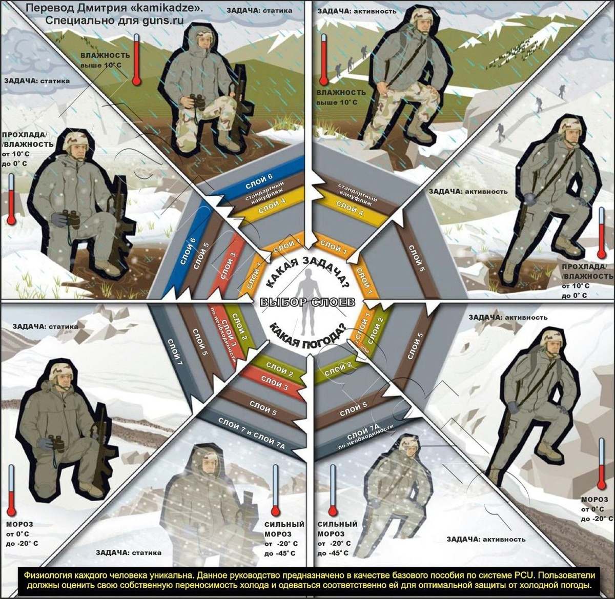 Чтобы избежать перегрева и переохлаждения организма, была разработана система слоёв в одежде. Всего выделяют семь слоёв (см. изображение), но для нас, обычных людей, можно упростить и сократить до трёх: базового, среднего и внешнего. Базовый слой регулирует температуру тела, отводя влагу. Например, хлопок хорошо впитывает и удерживает влагу, создавая ощущение холода, поэтому базовый слой одежды должен быть сделан из других материалов. Синтетические ткани из полиэстера, такие как «CoolDry», «PowerDry» и «CoolMax», эффективно выводят влагу от кожи. Они не накапливают испарения, а распределяют их по своей поверхности, откуда влага легко испаряется. В результате сохраняется комфорт даже при потоотделении. Для поддержания прохлады летом и предотвращения гипотермии при экстремально низких температурах важно оставаться сухим. Средний слой обеспечивает теплоизоляцию. Флисовые жилеты, куртки и брюки — это изделия для среднего слоя одежды. Они не только удерживают тёплый воздух, но и отводят вла