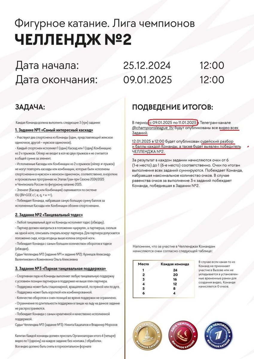 ФФККР и «Первый канал» пока не опубликовали итоги Челленджа № 2 – очередного конкурса в рамках Лиги чемпионов фигурного катания, нарушая установленный ими же самими дедлайн. В турнире «Лига чемпионов. Фигурное катание» — небольшая (пока хочется думать, именно так) заминка. На новогодние каникулы были запланированы два очередных «заочных» тура – «Вызов капитанов» № 2 и Челлендж № 2. Но если с капитанским конкурсом вышло, «как надо», практически в запланированные сроки, то со вторым командным челленджем дела обстоят не столь гладко. Его итоги по графику должны были быть подведены не позднее 12 января (а предварительно, 9 – 11-го числа должны быть опубликованы видео заданий). Но, к сожалению, ни то, ни другое пока не сделано. Кто в этом виноват, также остаётся неизвестным. Конечно, помня Регламент этого многоэтапного турнира с достаточно обтекаемыми формулировками, всегда можно ожидать разных «поправок» от организаторов. Но даже в этом случае разумно предполагать соответствующее ин
