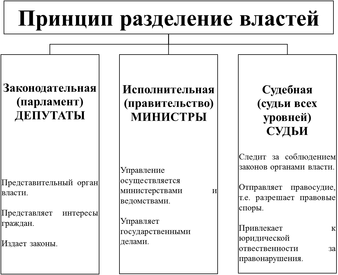 Разделение властей в РФ согласно Основному закону государства заключается в разграничении функций между государственными органами власти. Так, каждый государственный орган выполняет только функции своей ветви власти, которые представлены разными органами власти.