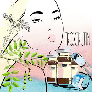Троксерутин – полусинтетический ангиопротектор, обязательный ингредиент мезококтейлей дренажно-сосудистого и капилляростабилизирующего действия. Является производным рутина, или витамина Р, – биофлавоноида, содержащегося в зелени гречихи, листьях пахучей руты, бутонах софоры японской. Дорогой аналог троксерутина – троксевазин. Благодаря выраженной венотонической активности, троксерутин относится к группе важных и жизненно необходимых лекарств. Он укрепляет стенки кровеносных сосудов, повышает их эластичность. Препарат уменьшает ломкость и проницаемость капилляров, восстанавливает микроциркуляцию. Троксерутин оказывает противовоспалительное действие, ограничивая прилипание тромбоцитов к поверхности сосудистой стенки. Наряду с активизацией кровообращения усиливается лимфодренаж. Улучшение трофики тканей приводит к снятию отеков. Соединение является участником окислительно-восстановительных процессов организма. Оно стабилизирует гиалуроновую кислоту клеточных мембран, блокирует процессы о