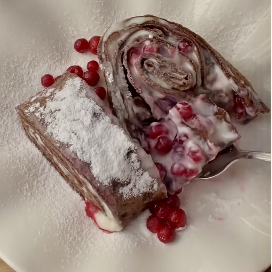 Смотрите видео рецепта тут Ингредиенты: -1 яйцо -300 мл молока -100 г муки -15 мл растительного масла -1 ст.л какао -20 г сахара -1 столовая ложка творожного сыра -2 ст.л сметаны -набор кухонных принадлежностей от hilZz из 13 предметов, артикул на Wildberries 178597922 Смешиваем яйцо с сахаром, молоком, мукой, какао и перемешиваем до однородности. Блинчики выпекаем с двух сторон. Готовим крем: смешиваем творожный сыр, сметану и три столовых ложки сахара. Выкладываем блинчики на тарелку и смазываем кремом. Аккуратно скручиваем в рулет и убираем в холодильник - через 20 минут можно подавать. Готовьте с любовью - готовьте с hilZz 🫶🏼