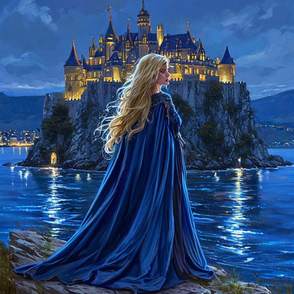 Попросила яндекс арт воссоздать похожую картинку, но, конечно, картинка совсем не похожа, ни платье, ни девушка, ни замок.