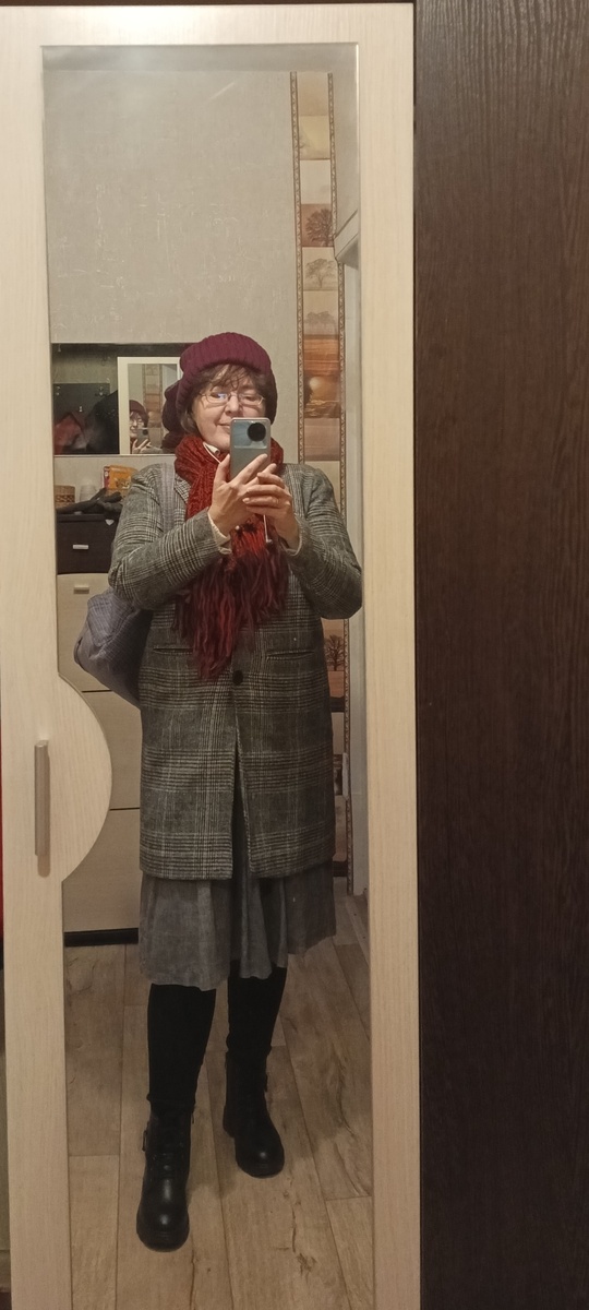 Старую серую юбку. Пальто в клетку. Страшно длинный пушистый шарф намотать вокруг себя раза три можно. Ну и шапку гнома.